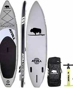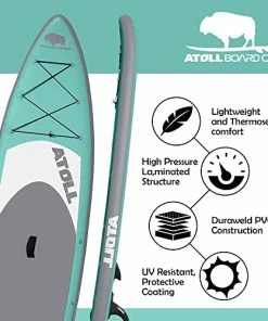 I was a bit hesitant before purchasing this board, only because I had never heard of Atoll before and didn’t know what to expect. My wife and I have been pricing paddle boards and reading reviews for months so when this one showed up in my search at a lower price than a lot of the others, it got my attention. After a few emails to the manufacturer and as much research as I could find online, I decided to pull the trigger. The 2 year warranty, amazing communication and customer service from the manufacturer combined with amazon’s return policy helped make the decision a whole lot easier.Shipping was fast and the board showed up on my doorstep in a couple of days. As soon as I opened the box I was immediately convinced I had made the right decision. Packaging is neat an carefully wrapped. Everything described was included in the box. I’ll descibe everything in as much detail as I can because I know some people are like me and want to know all the details before they buy something. Hopefully this will help make a few people’s purchase decision a little easier.The package contains the board, a carrying bag, a 3 part adjustable paddle, a repair kit, and a pump. The board itself is made from thick pvc material, kind of like a zodiac boat if you know what that is. The deck pad is a thick comfortable foam that seems like it will hold up well. The baord is slightly heavier than other inflatable boards I’ve felt but I love that because to me, it feels sturdier and better-built. The board came rolled up and includes a nylon strap to hold it together when rolled . It also includes 2 inflatable “donuts” that slip over the 2 smaller fins (which are not removable) to keep them from rubbing holes in the bag or scratching the board. They’re a little thing, but a nice touch.There is a large detachable fin that easily slides into the fin box on the bottom of the board. What I like about this one is the thumb screw that attaches the fin is secured to the fin itself so there is no hardware to worry about losing when taking it on and off by the water. Once secured, it feels rock solid and I had no concerns about it falling off.I inflated the board to the recommended 15psi and just as in the photos, it’s sturdy enough to lay across 2 chairs and stand on. It does have some flex to it, but you’re going to have that with any inflatable board. The pump that it comes with has it’s own smaller bag to keep sand off. It has a built in pressure gauge so it’s easy to see what pressure you’re at as you pump. The hose on the pump attaches to the board with a twist lock mechanism. The valve on the board can be locked open to deflate the board but should be left in the spring-closed position to inflate. It attaches securly to the hose and I didn’t hear any air leaking out as I pumped. It’s not difficult to operate the pump but as others have said, it can get a little exhausting pumping it up all the way, especially if you take it to the full 15 psi. It gets harder to press as the pressure builds so the last few psi are pretty tough. Again, that can be expected with any inflatable paddle board though. If you don’t want the upper body workout, get an electric pump. I didn’t find it too terribly difficult. Besides, the convenience of having a board I can take anywhere and keep in the trunk of a car more than makes up for the small cardio and upper body workout I get before I use it.The board handles well on the water. I’m an intermediate paddleboarder. I’m not super fast, but I’ve been on several boards so I do at least have something to compare to when it comes to stability. My wife has a 12′ foot fiberglass board. Although it’s not quite as stable as hers, it’s also a foot shorter and inflatable. It is however, much more stable than the 10’6″ hard board I had been on previously. I was amazed at just how stable the Atoll board feels on the water. I jumped right up without having to “get the feel for it” and never had any trouble balancing. I rocked my feet back and forth to see how far I could get it to tip ton one side before it became unsteady to the point of falling off, and again, I was pleasantly surprised with the result. It’s super stable. I did notice if you jump up and down, you can definitely feel the “springiness” that comes from having an inflatable board. However, it didn’t effect my experience in any way, even when paddling in light chop.Paddling in the chop was no problem. Although the board is mostly flat, it does have some rocker built into the front so it handles chop and waves quite well. It’s pointy nose glides through the water easily and when paddling side by side with my wife, I noticed my board was faster than hers, even though we were taking similar strokes. It also turns on a dime and is extremely manuverable.The paddle that comes with the board is adjustable and breaks apart into 3 pieces, although you really don’t need to do that because it fits in the bag just fine when it’s in 2 pieces. It’s heavier than my wifes carbon fiber paddle, but it’s aluminum so that’s a given. I love it though. It feels sturdy and well built and the handle is very comfortable. I like that it has marks on the side of the telescoping handle so you can easily set it to your preferred length every time you use it. A simple twist lock releases the tension and allows the telescoping end to go in or out.Everything fits into a convenient backpack carrying bag. The bag has 2 shoulder straps as well as a waist buckle which helps take some of the weight off your shoulders. Sounds like a simple thing but on a long beach walk or hike, that makes a huge difference.I hope I’ve covered everything that a prospective buyer would like to know before purchasing. I’d be happy to give more details to anyone interested. Overall, I would highly recommend this board. Just make sure you do your research and know about the pros and cons of having an inflatable board. Th