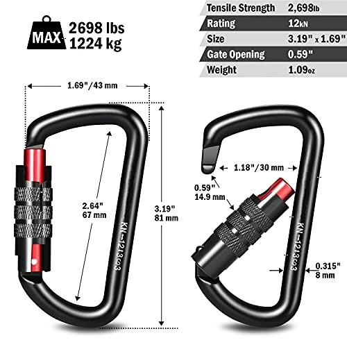 - ใSTRONG CARABINERใ- Major axis strength 12KN (2698lbs), it’s very safety to hang heavy stuff such as hammock, hammock chair, swing, aerial yogo, punching bags etc