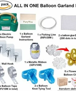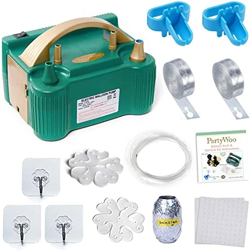- 18 PACK ALL IN ONE BALLOON GARLAND KIT: 1 x balloon garland instructions; 3 x wall hook; 2 x balloon knot tying tool; 5 x flower balloon clips; 1 x electric balloon pump; 2 x balloon glue sheets (200 dots in total); 2 x balloon tape (32Ft/10m in total); 1 x fishing line (98Ft/30m in total); 1 x metallic ribbon (32Ft/10m in total). Input voltage: 110V-120V. Air pressure: 13000pa. Power: 600W. Noise: <95dB