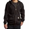 The heavyweight champion of sweatshirts is made of 13-ounce, 75% cotton/25% polyester fabric and has a Rain Defender durable water-repellent finish. The zip-mock collar has an 8-inch antique-finish brass zipper. It is designed with spandex-reinforced rib-knit cuffs and waistband to keep the cold out. There’s an attached three-piece jersey-lined hood with draw cord and front hand-warmer pocket. The Carhartt logo is embroidered on the front left pocket.