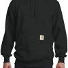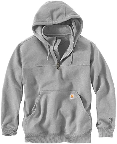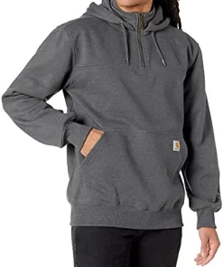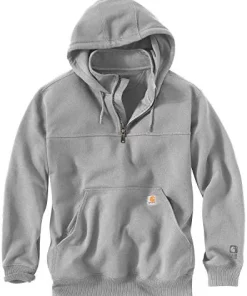 The heavyweight champion of sweatshirts is made of 13-ounce, 75% cotton/25% polyester fabric and has a Rain Defender durable water-repellent finish. The zip-mock collar has an 8-inch antique-finish brass zipper. It is designed with spandex-reinforced rib-knit cuffs and waistband to keep the cold out. There’s an attached three-piece jersey-lined hood with draw cord and front hand-warmer pocket. The Carhartt logo is embroidered on the front left pocket.