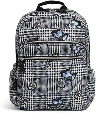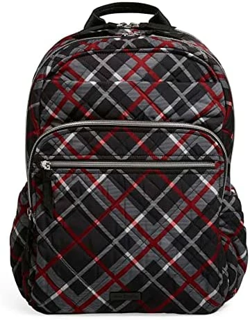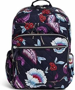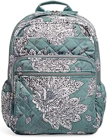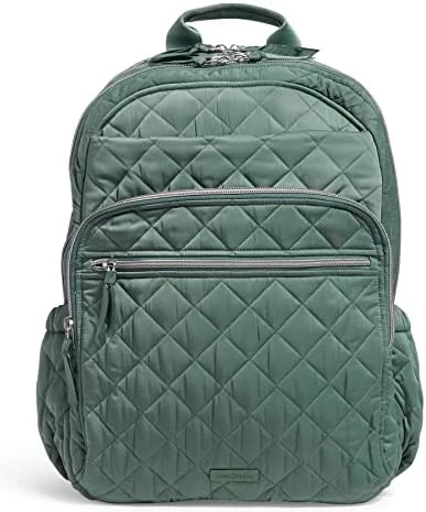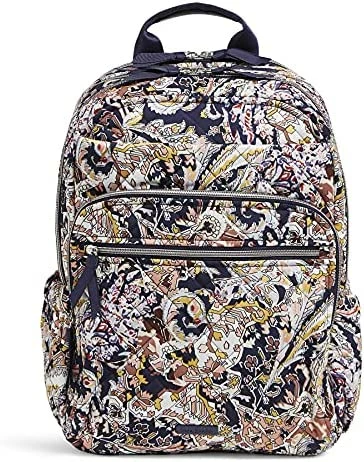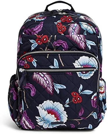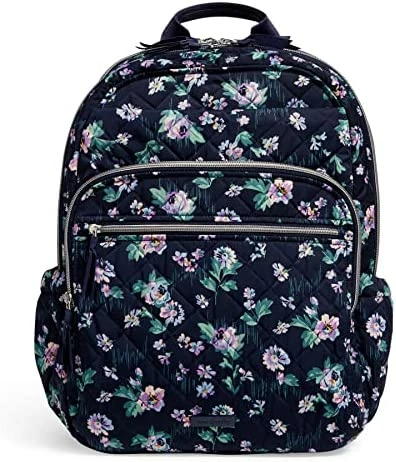 A fashionable practical style that keep you fresh on-the-go the zippered polyester Vera Bradley Performance Twill XL Campus Backpack with a top handle and adjustable shoulder straps. Performance twill is made from quilted, sleek, lightweight, water-repellent polyester. Exterior features two side slip pockets, six zip pockets, and flat bottom. Exterior back slip pocket. Interior features fabric lining, six slip pockets, one ID holder, and one card slot.